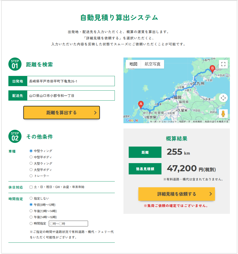 双葉運輸のサービスページでは、チャーター便費用の自動見積もり機能を導入しております。状況に合わせた費用感を今すぐ知ることができますので、是非ご活用ください。